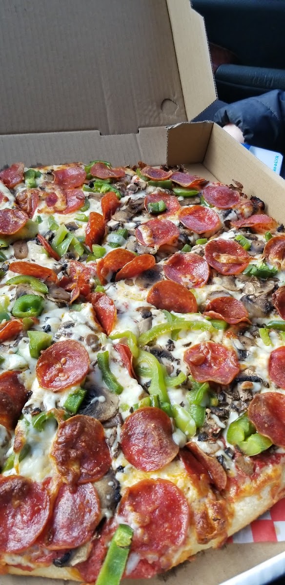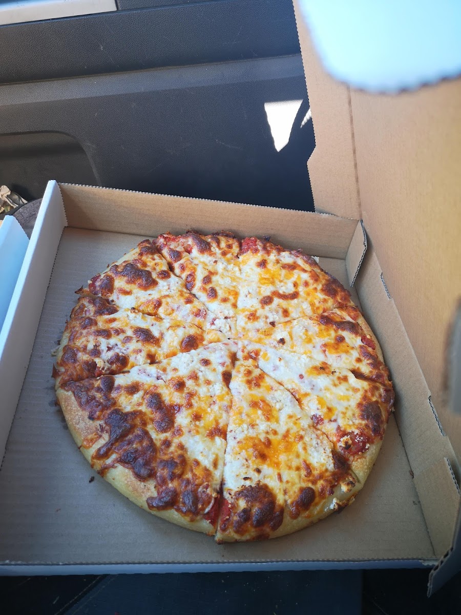 Pizza was good warm but once cold was a little chewy. Plenty of toppings and a great easy place to stop off the highway and continue on your way.